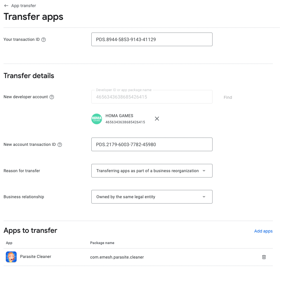 APK translations: If you have any translation projects in progress using Google Play's translation service, they need to be completed before your app(s) can be transferred.