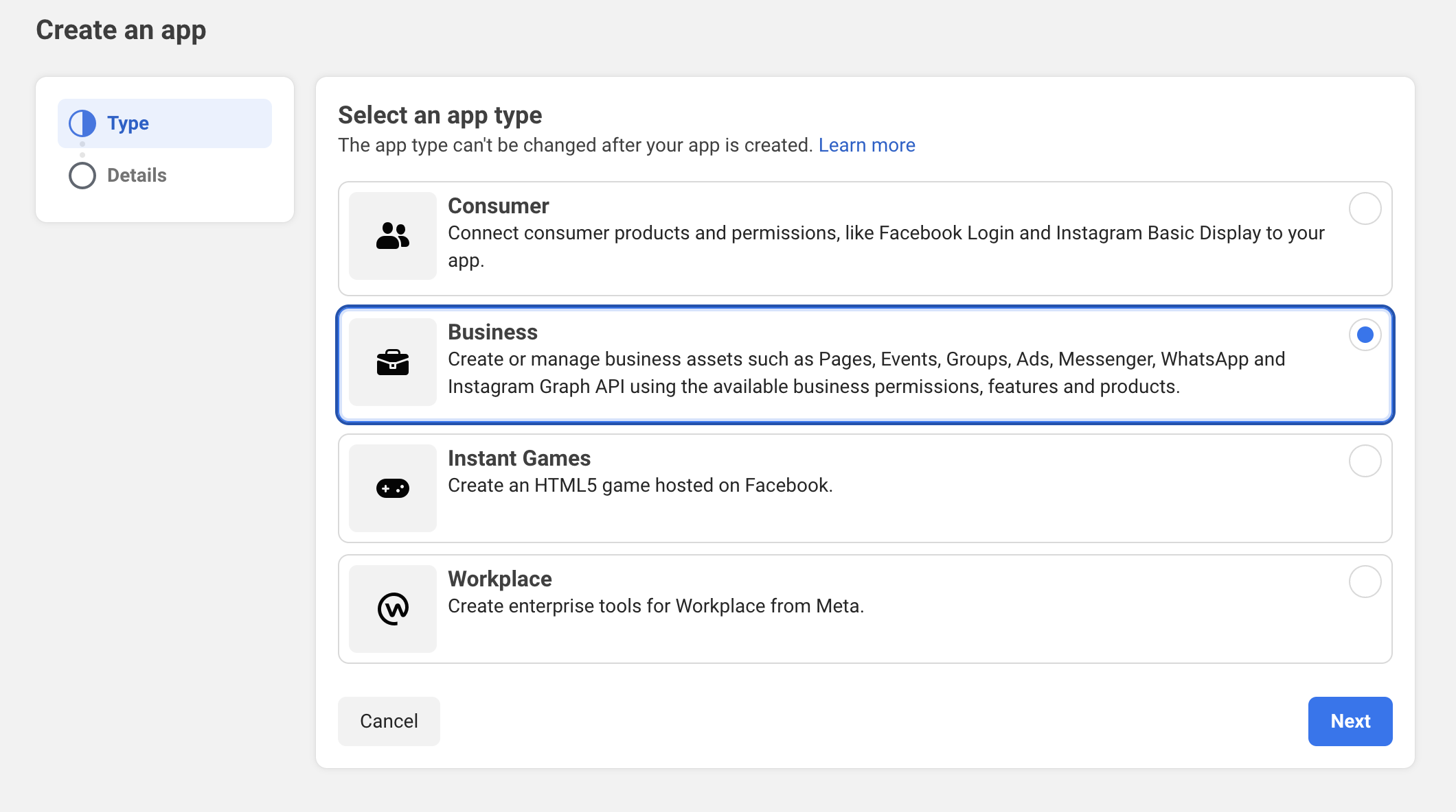 - Select Business as the app type.