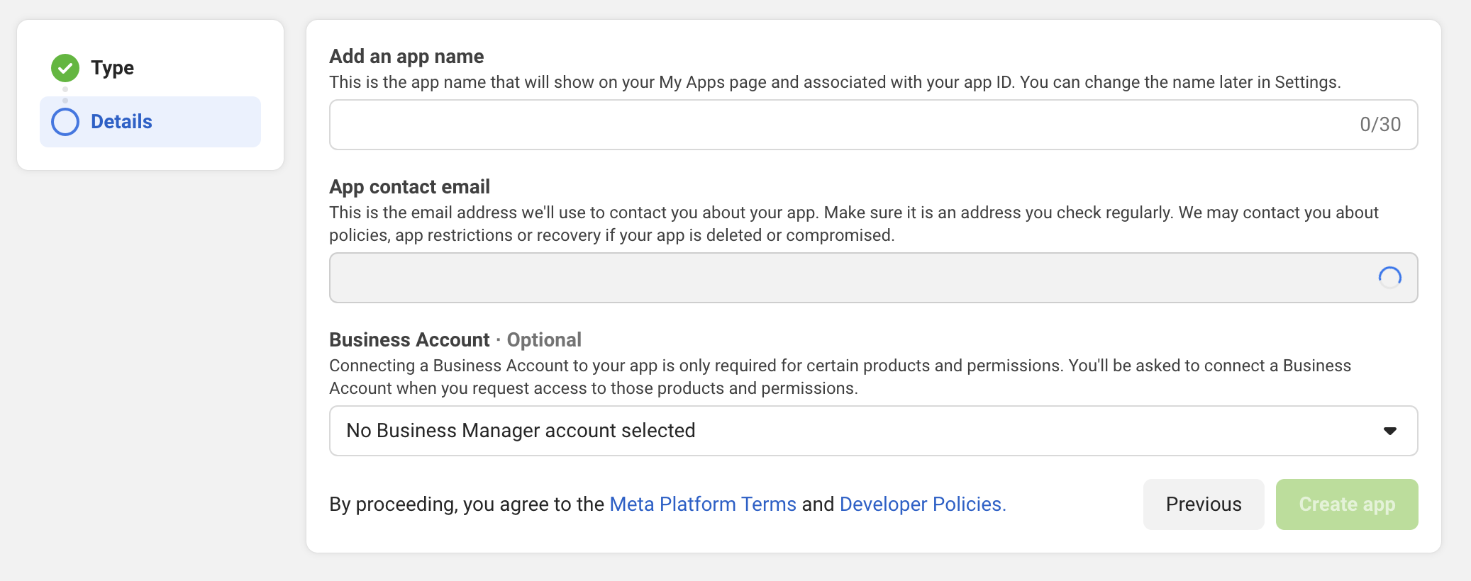- Fill in the details section with your app name and your contact email, then click on "Create app"