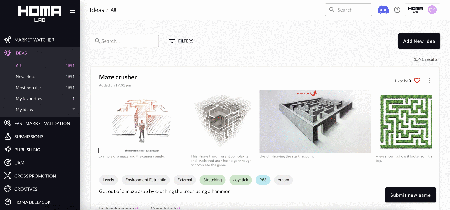 To search for an idea, simply use the search bar where you can look up ideas by keywords. Another way is to use the filtering which will expose you to specific ideas that meet the filtering criteria that you will set.