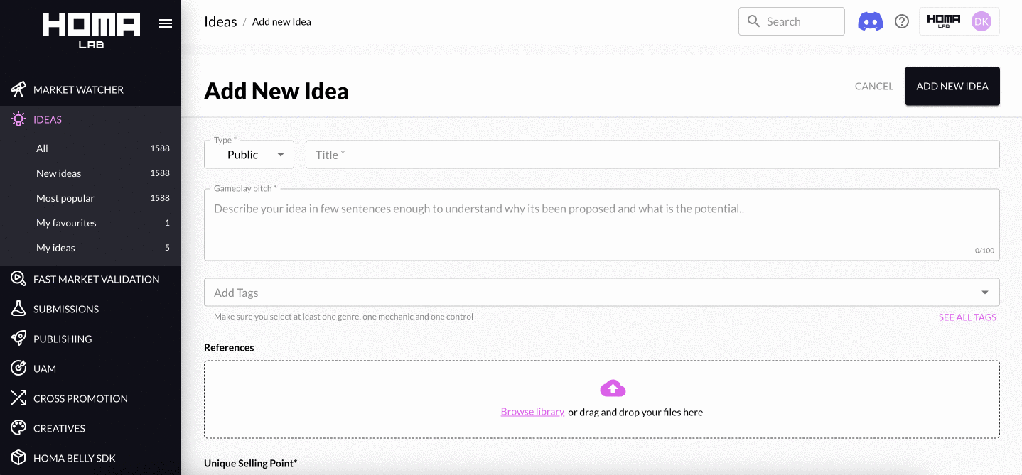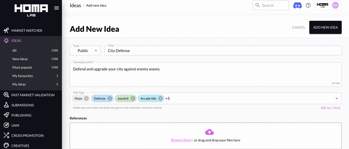 Step 5. Add references - show us what you have in mind! The more original the idea the better! You can add as many references as you like. No matter the source - if it inspires you, show it. A reference can be anything that inspired you to create an idea. Dont be afraid of creating something original, like a sketch. :) You can add pictures, GIFs, videos, links, sketches, drawings, prototype recordings, and you can also use our reference library where you can search for references by keywords. After uploading your references it is required to add a description to every reference. This helps us understand how this reference relates to a game idea, and how it translates to a game.