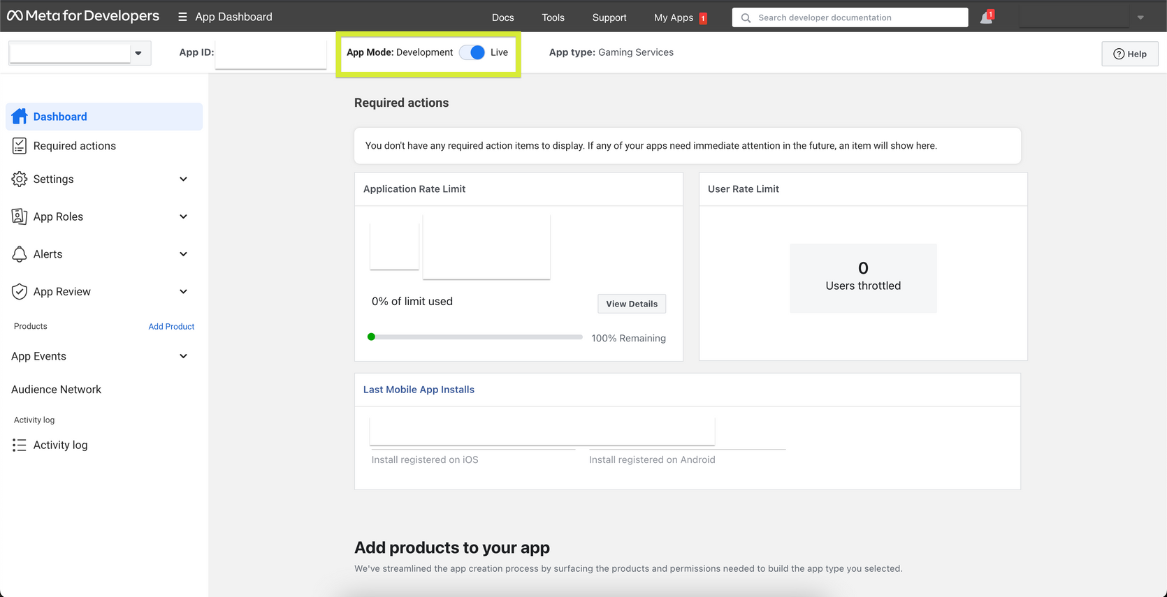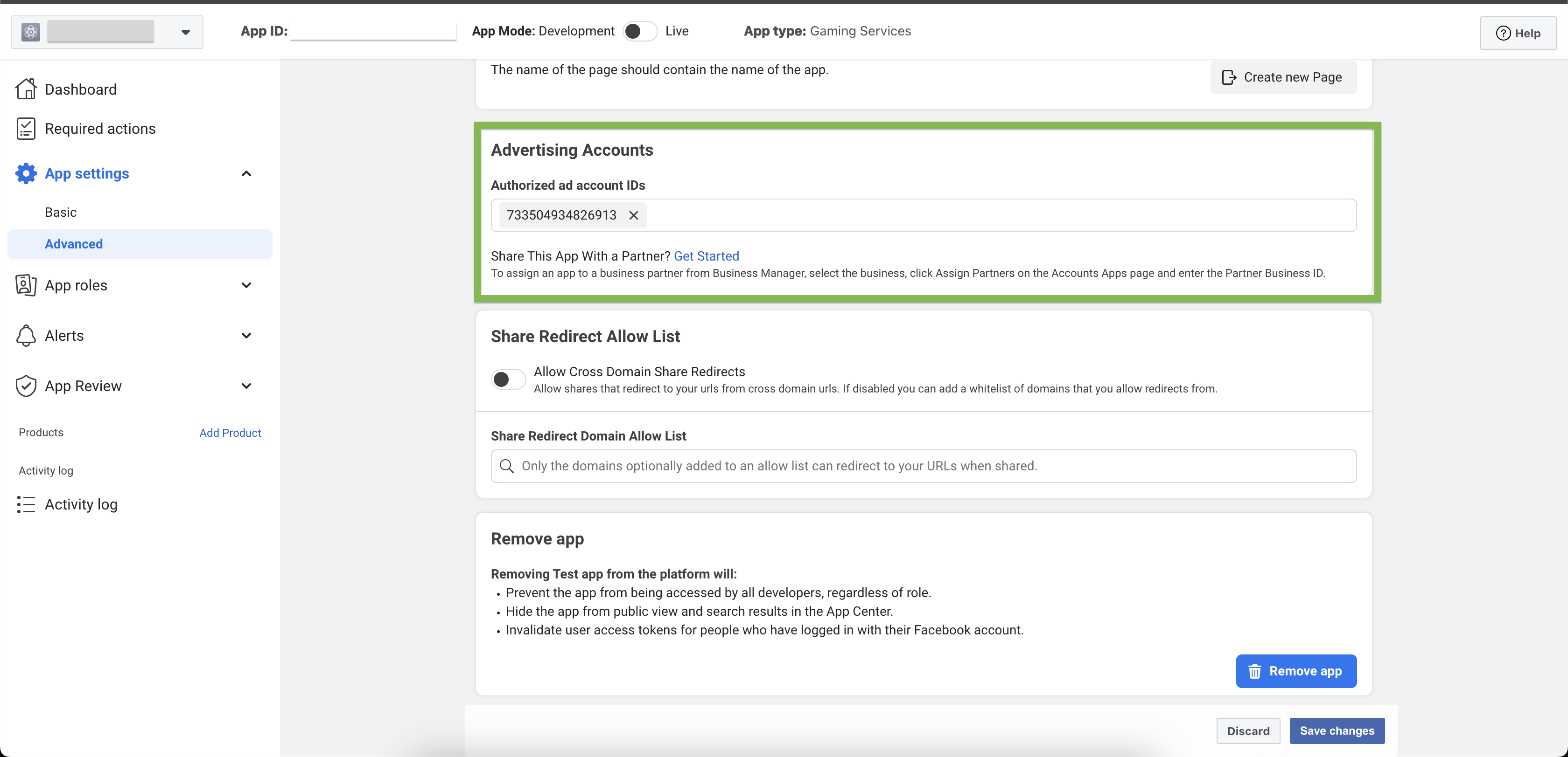 Dans les vérifications de build, copiez l’Ad account ID affiché dans App & OS setup et collez-le dans le champ Advertising Accounts de votre application Facebook.