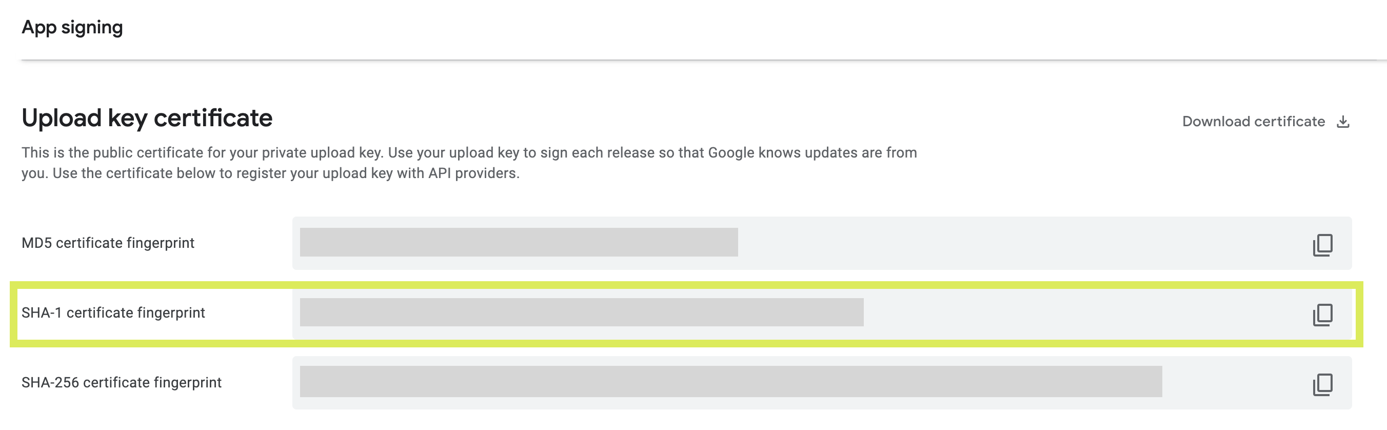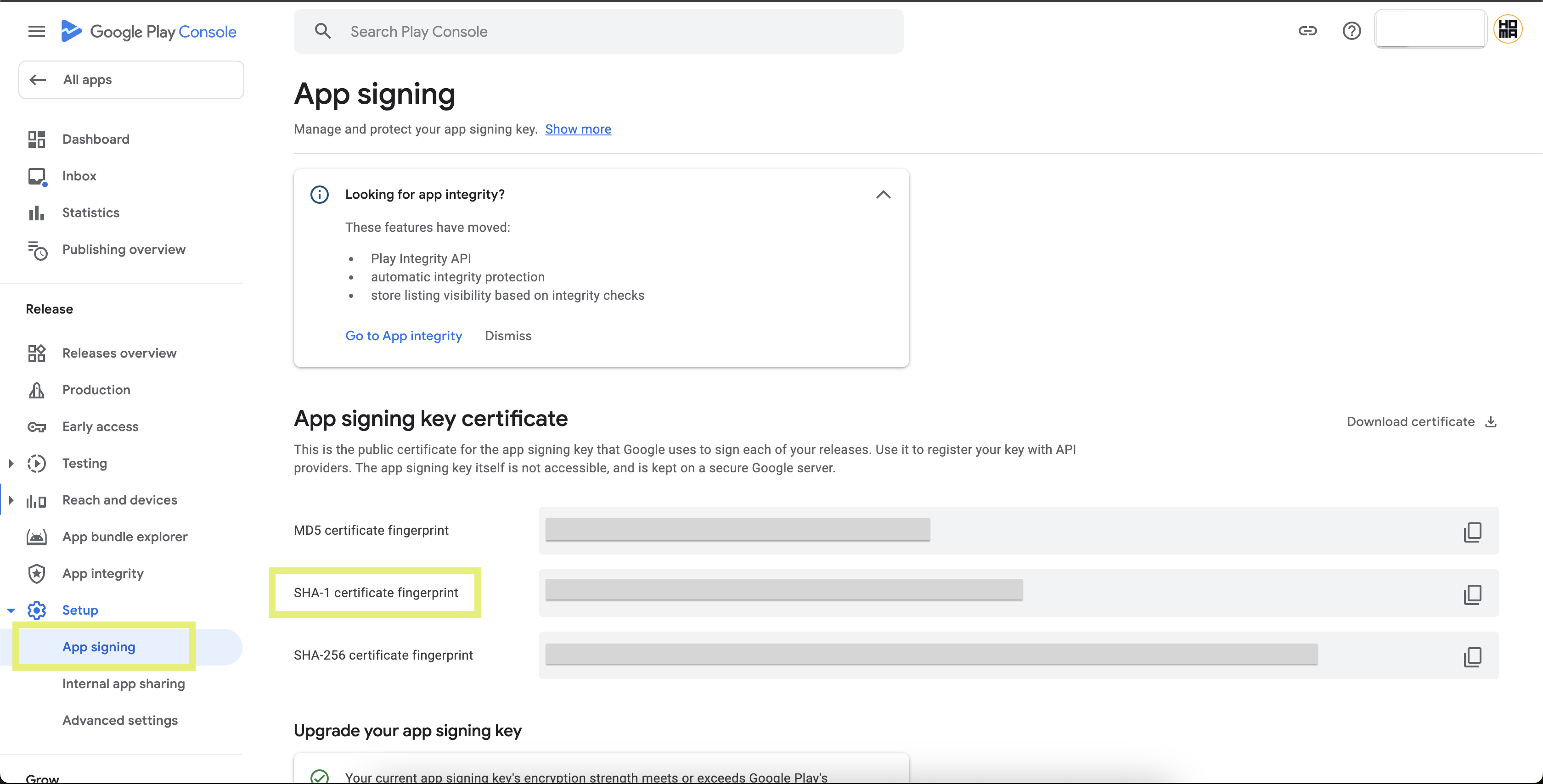 This process is required to reinforce the synchronisation between Adjust and your submission. It is a mandatory step for publishing. You can find this information on Google Play Console under Setup → App signing. In order to find the Upload key certificate on the same page, you need to scroll down. SHA-1 key is needed for both certificates.
