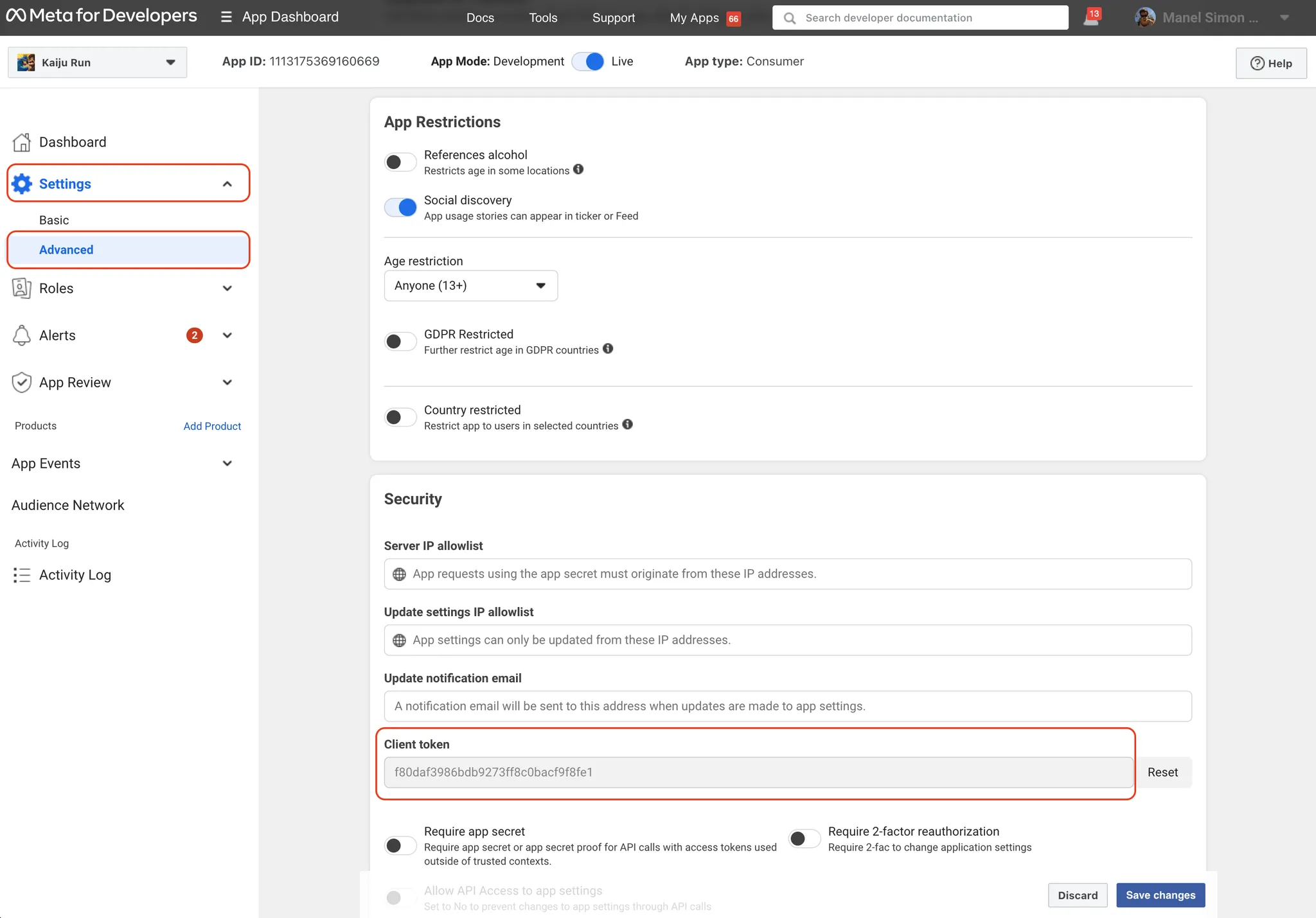 Si vous rencontrez encore des difficultés, merci de contacter notre équipe support et de leur fournir votre Facebook client token. Vous pouvez voir où trouver votre client token dans la capture d’écran ci-dessous.
